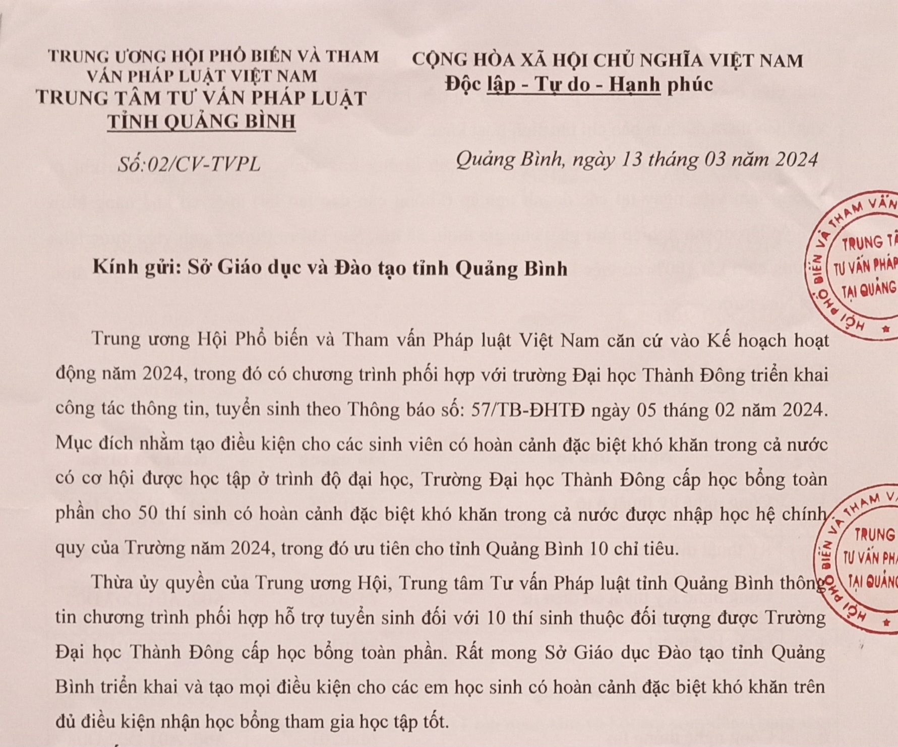 Trung tâm Tư vấn Pháp luật tỉnh Quảng Bình gửi Công văn số: 02/CV-TVPL đến ...